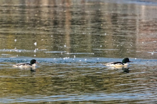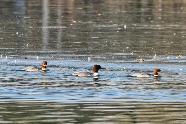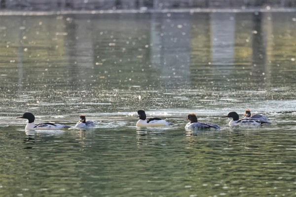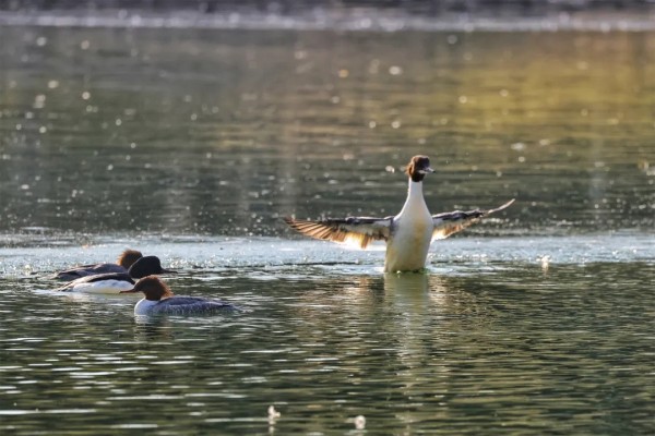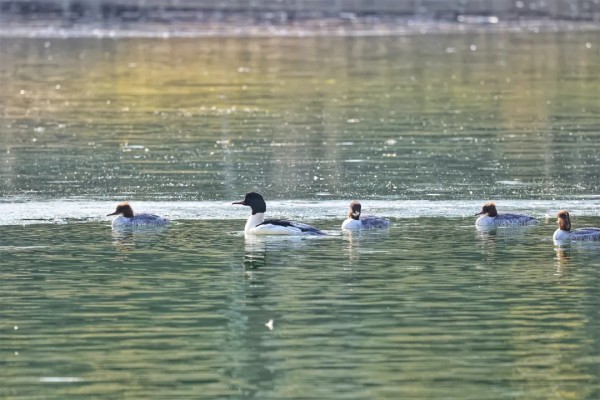 湖中央,十多只秋沙鸭正自在游弋。这越冬的贵客披着黑白相间的羽衣,时而扎入水中觅食,时而骤然展翅,翅尖掠过水面激起细碎涟漪,引得岸边游人轻按快门。