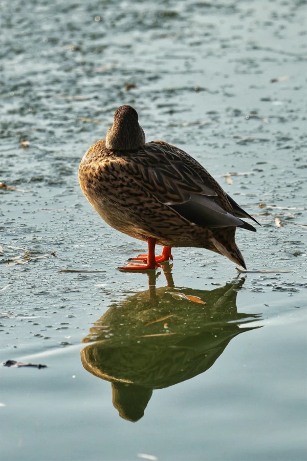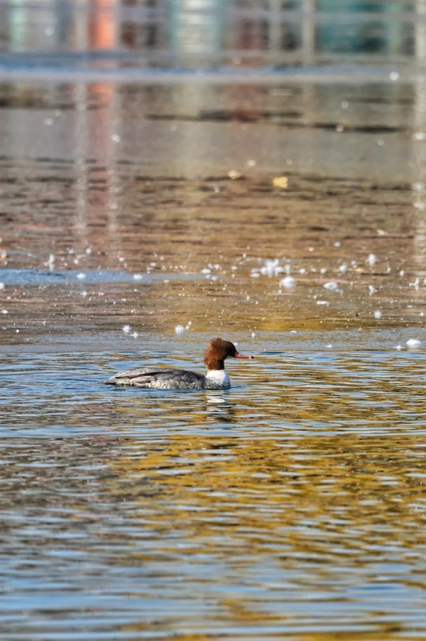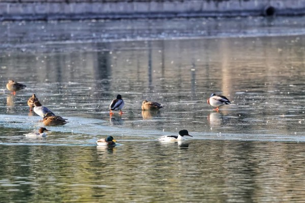 秋沙鸭身侧的鸳鸯、䴙鹈和绿头鸭是这里的“常驻居民”。它们三五成群,或在冰缝间戏水,或蜷在湖心岛休整,羽色与湖光相映,为初冬增添了灵动生机。