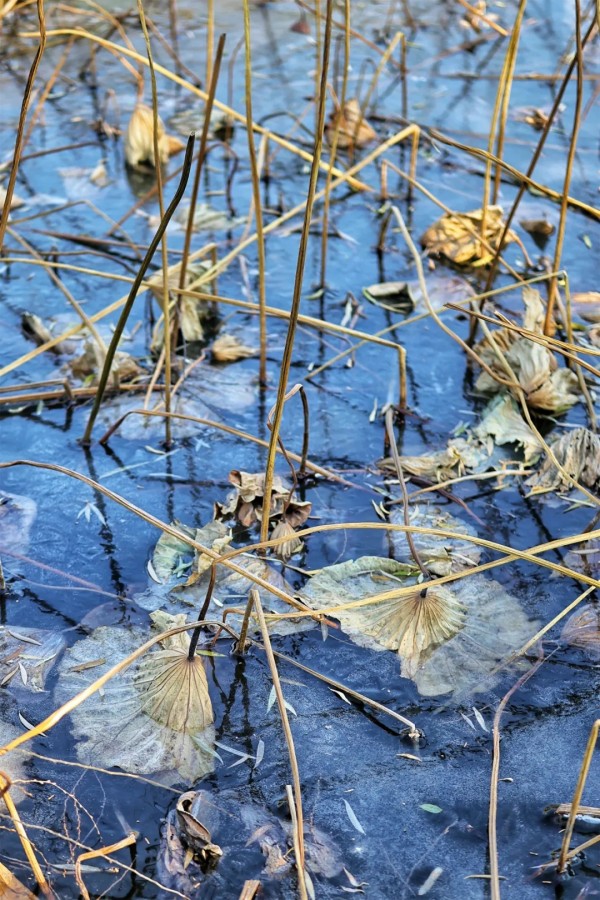 岸边的景致仍带着秋的余韵。垂柳未全黄,松柏更苍翠。残荷不再擎雨盖,却以枯枝勾勒出简练的线条美,在粼粼波光中倒映成水墨意境。