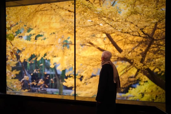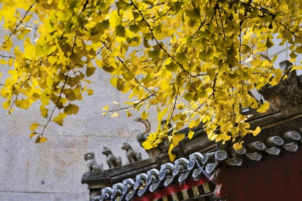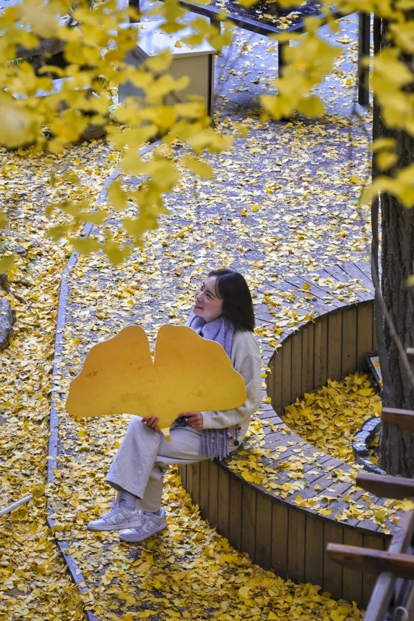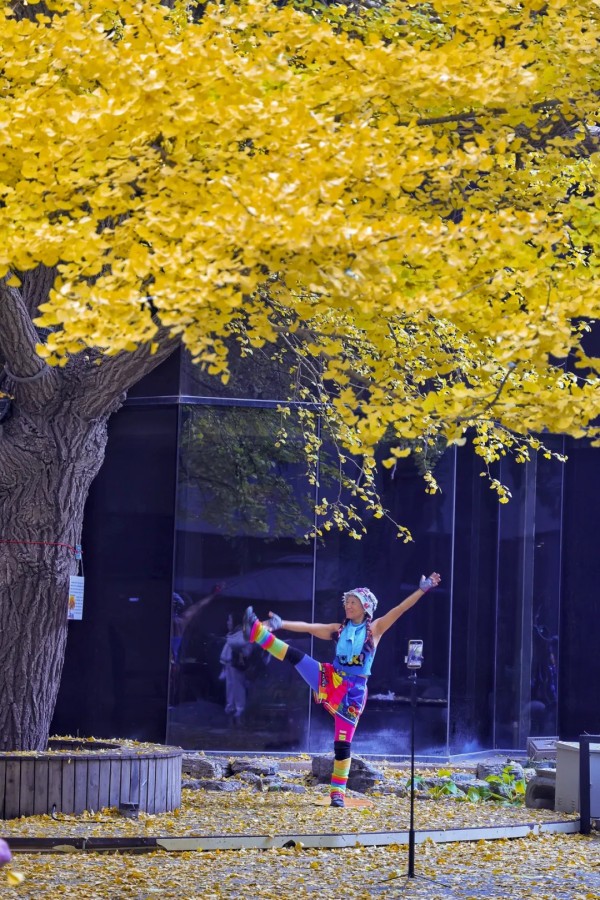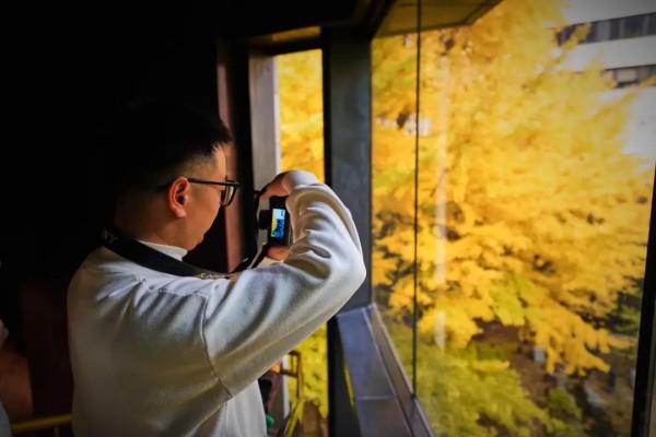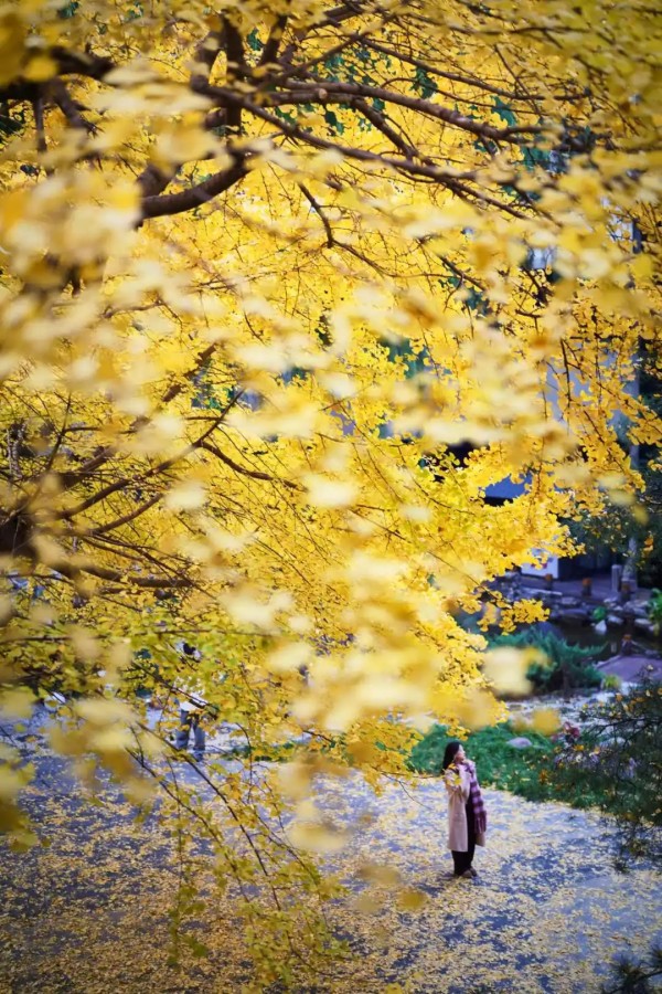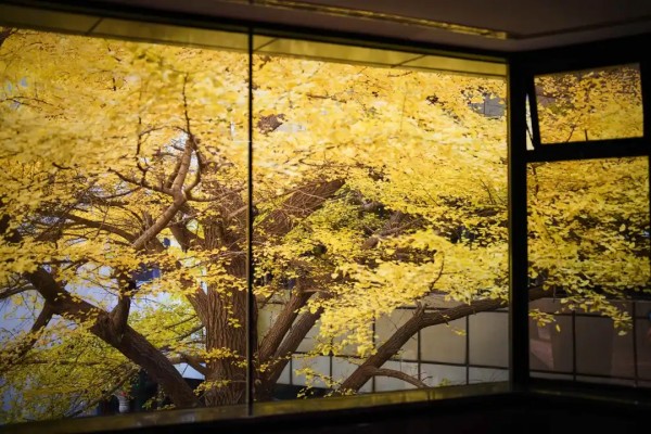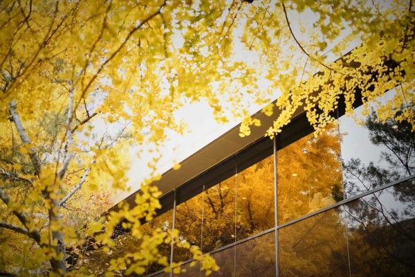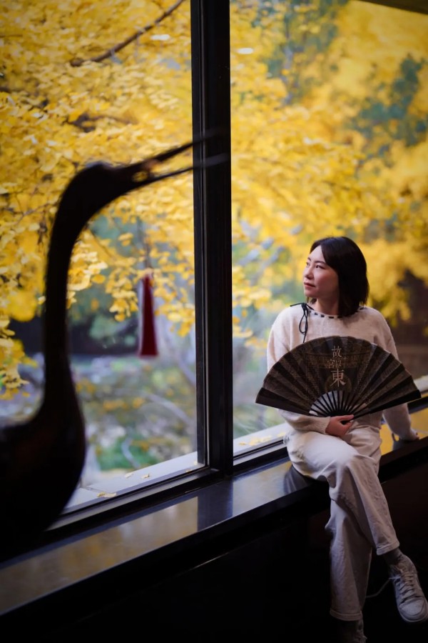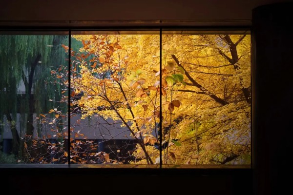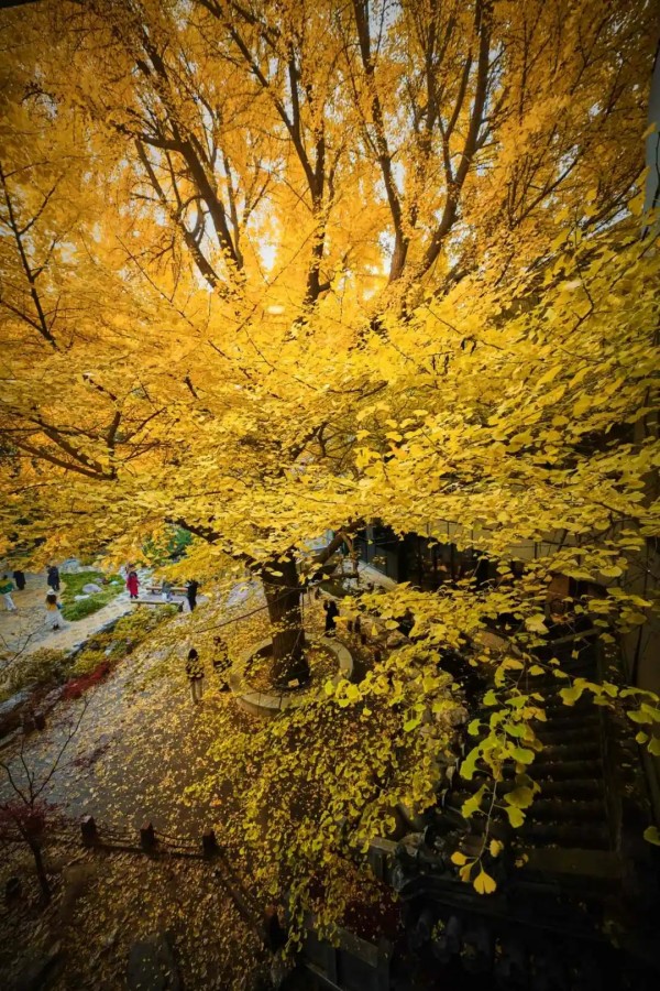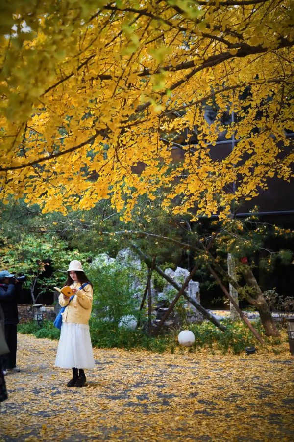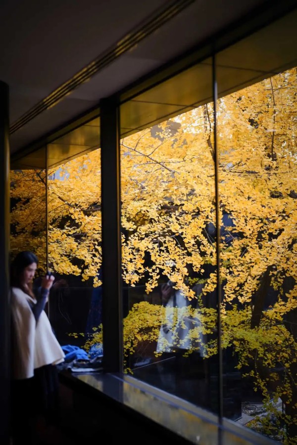 最动人的秋韵藏在二楼窗前。巨大的玻璃窗框住满目盛景,银杏树冠如鎏金云霞,铺满整片视野。近景枝叶婆娑,远景层次叠翠,随手一拍便是氛围感拉满的秋日大片。这扇 “银杏之窗”,不仅是拍照胜地,更成了连接古今的诗意镜像。