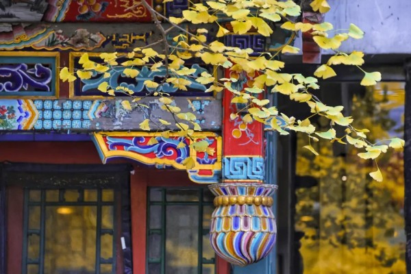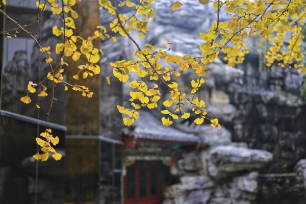 步入首都宾馆庭院,银杏枝干遒劲,叶片缀满阳光,泛着澄澈金辉。微风拂过,落叶蹁跹,为地面铺就一层松软金毯。朱红廊柱、黛瓦飞檐与这抹金黄相映成趣,勾勒出一幅古典雅致的秋日画卷。
