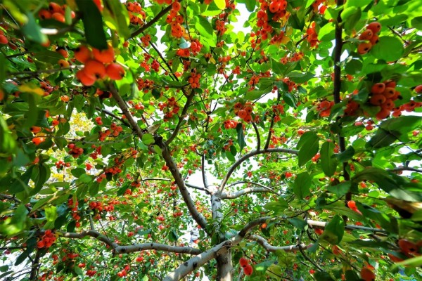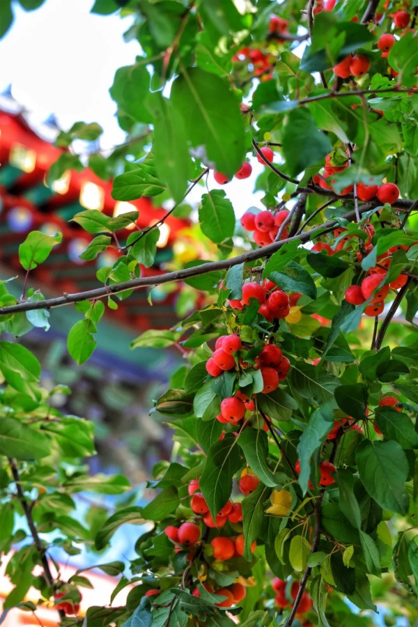 步入寺中,但见海棠已是硕果盈枝,红艳艳的海棠果如玛瑙般悬垂叶间,在秋阳下泛着温润的光泽。
