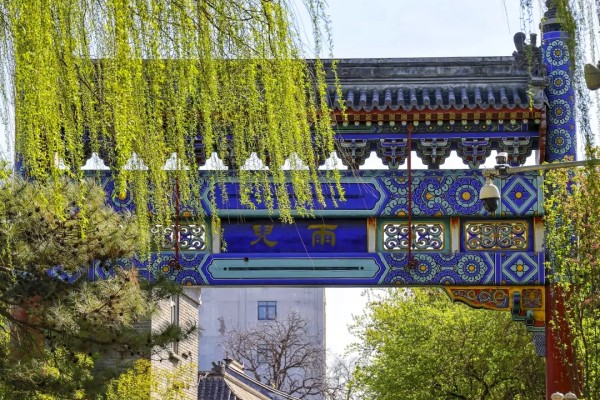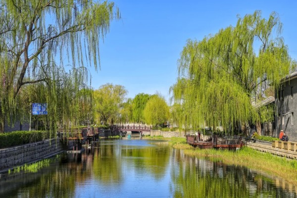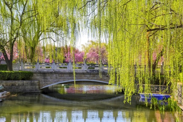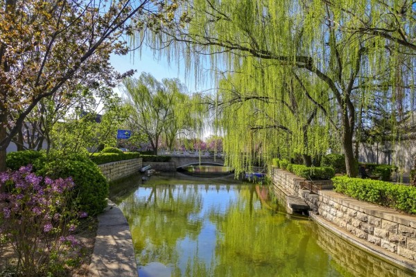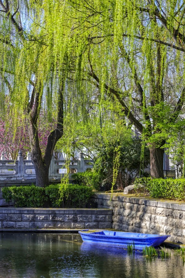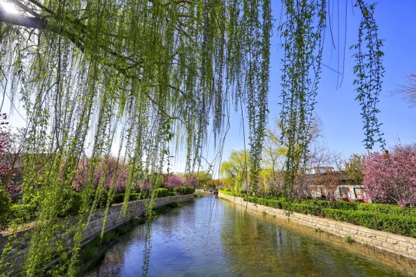 岸边垂柳依依,嫩绿新叶缀满枝条,随风轻拂水面,添几分灵动。