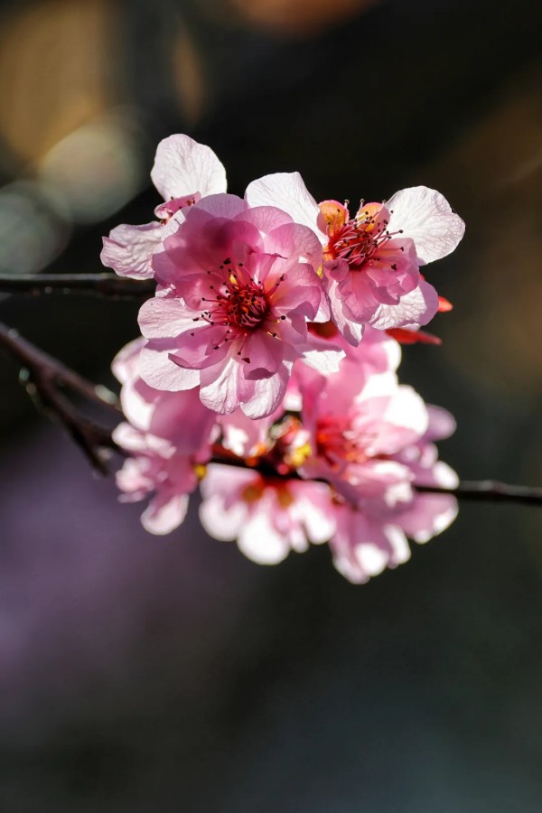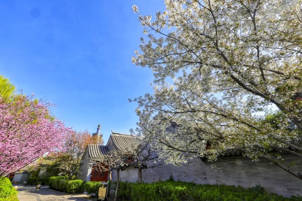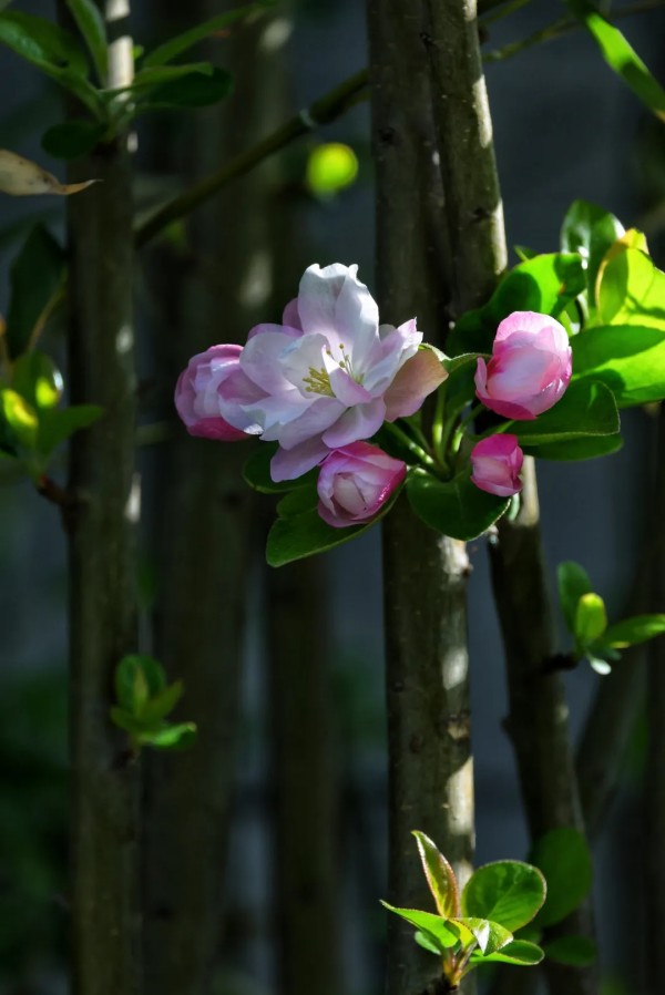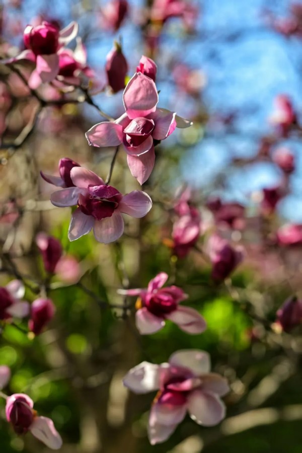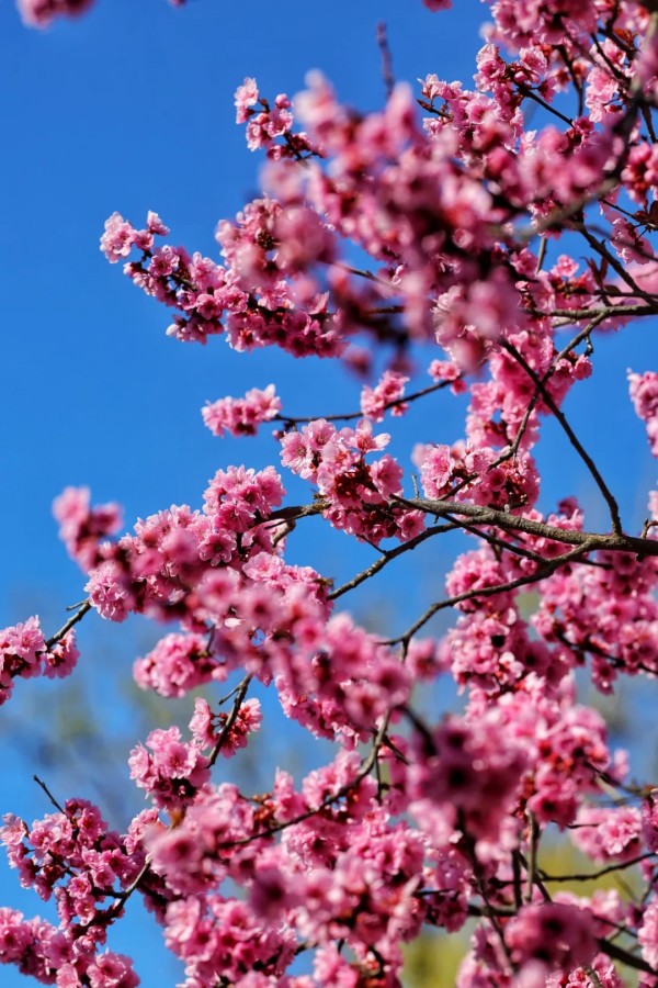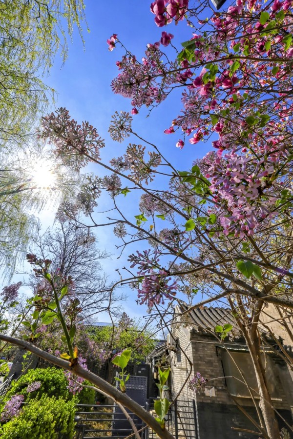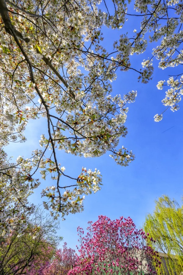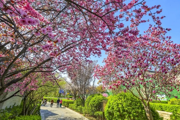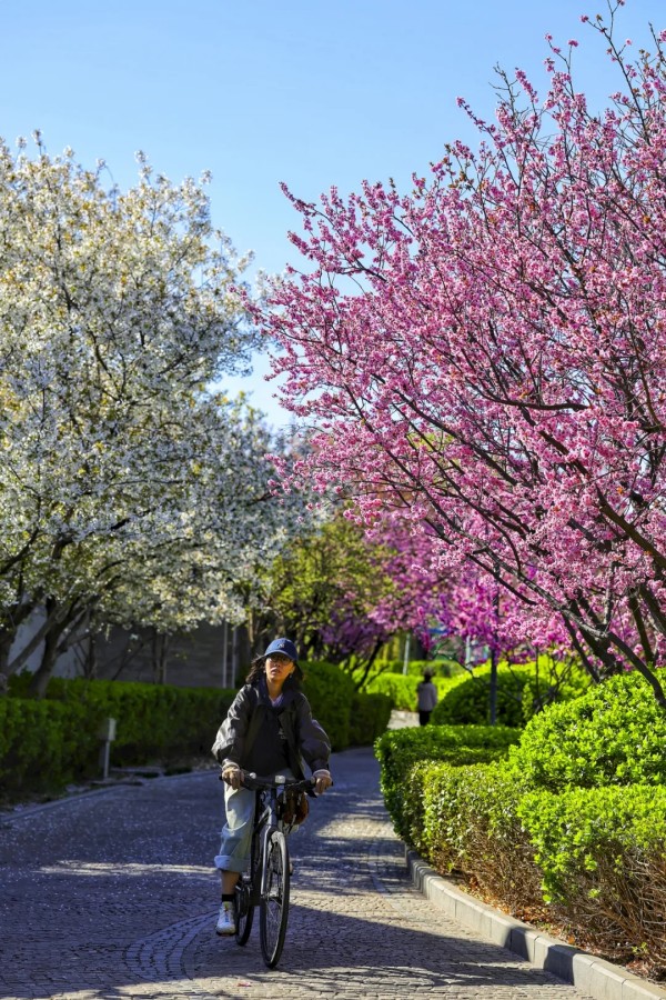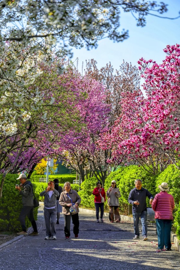 花丛次第绽放,各有风姿。玉兰亭亭,紫艳缀枝;西府海棠娇柔粉嫩,簇簇相拥;大岛樱粉白如雪,随风轻舞;丁香攒成浅紫花穗,暗香浮动;美人梅粉紫相间,妩媚动人。各色繁花相映,铺就一岸绚烂。