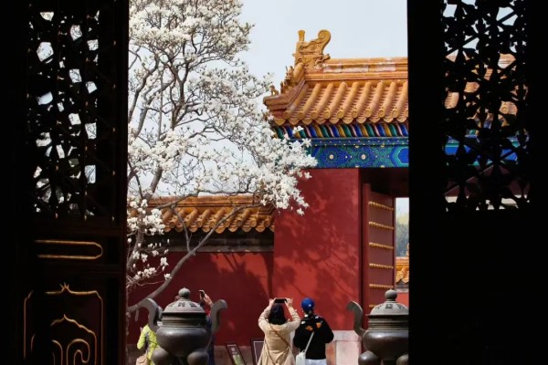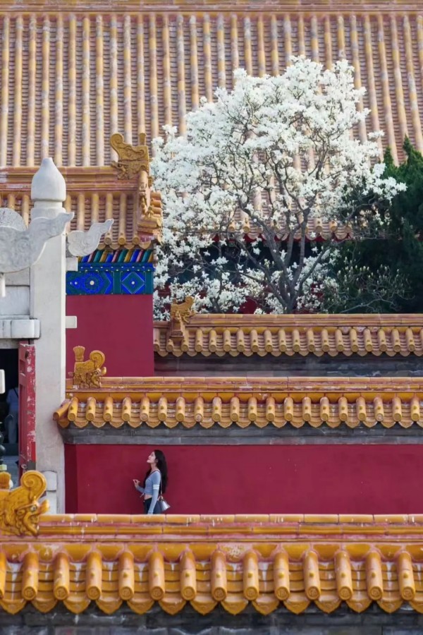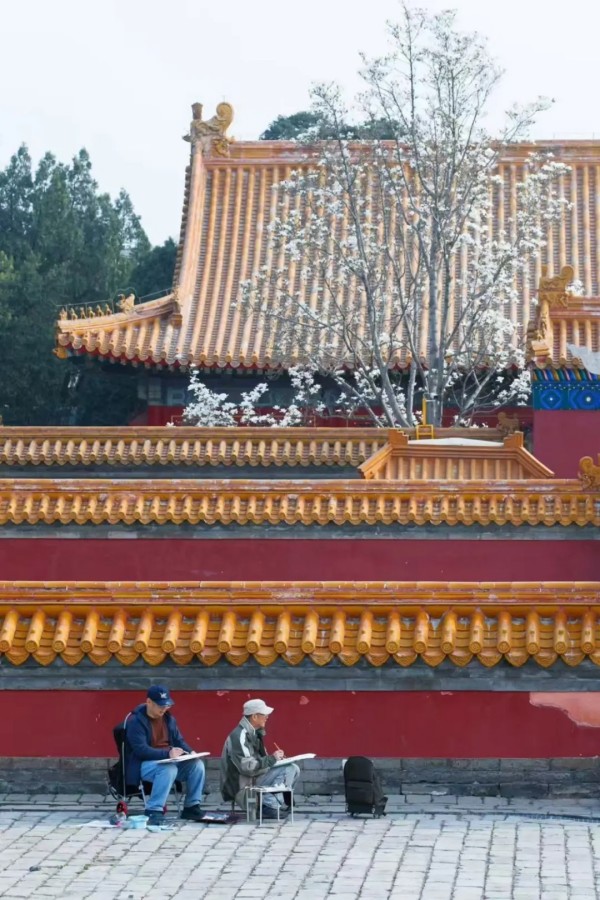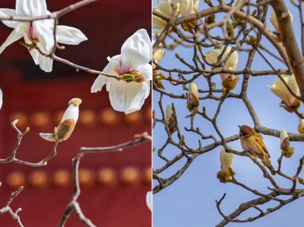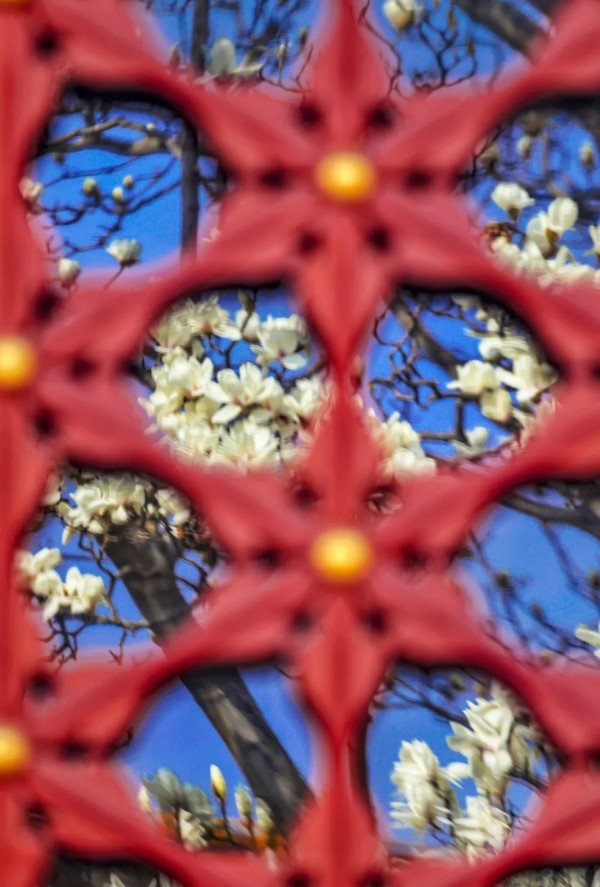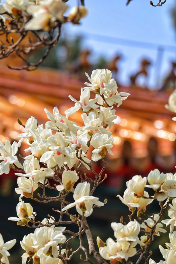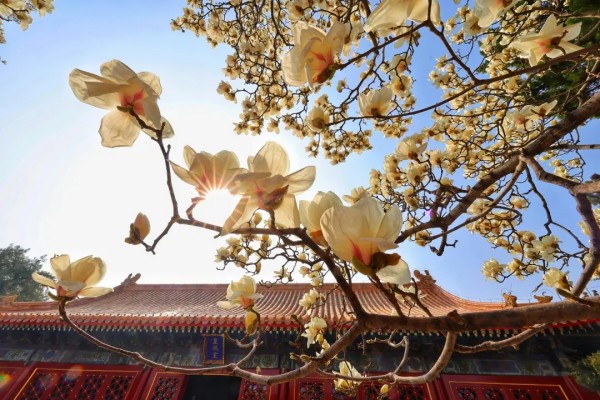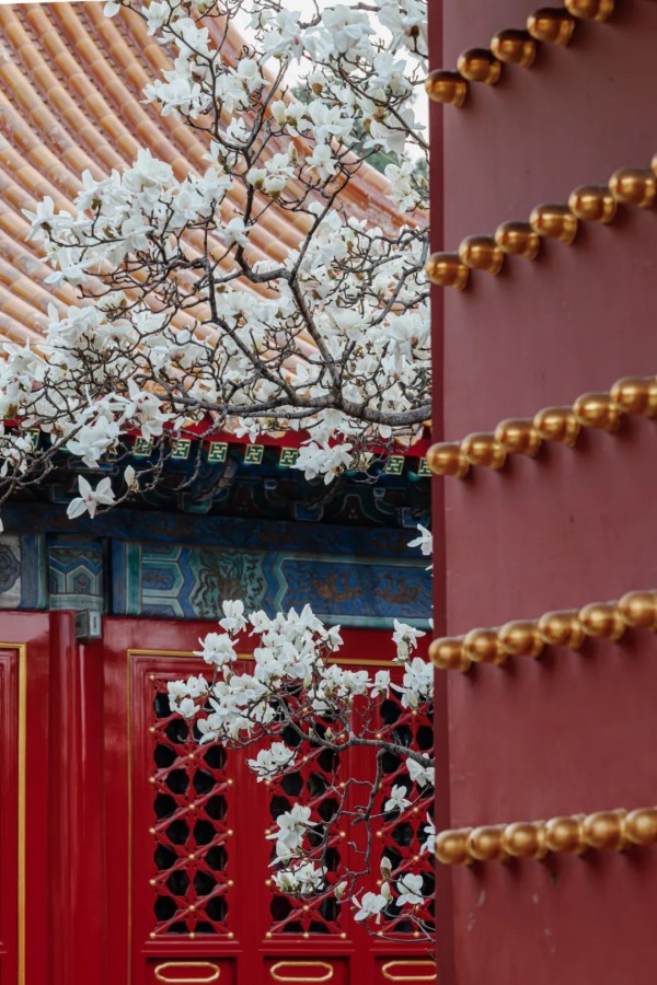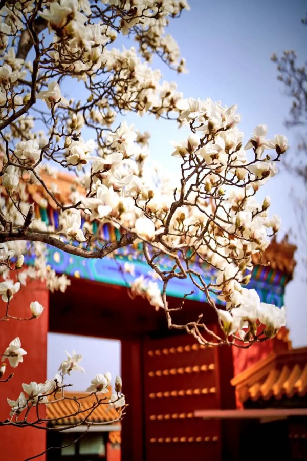地坛公园皇祇室前,玉兰已率先盛放。莹白花瓣缀满枝头,舒展如流云,衬着朱红宫墙与古建飞檐,端庄里透着热烈,仿佛把整个春天的气韵都凝在了枝头。