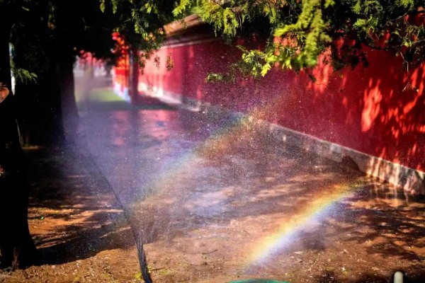 园内绿意渐浓,古柏林下光影斑驳,林间水雾散开,阳光斜洒而过,架起小小彩虹,引得游人纷纷驻足。