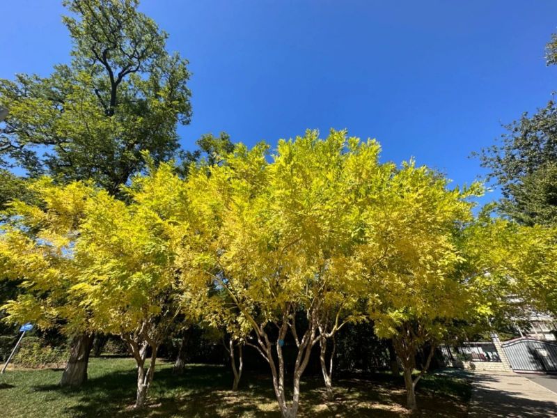 在袁庙广场,白蜡树的黄色树叶在阳光照耀下更加夺目。
