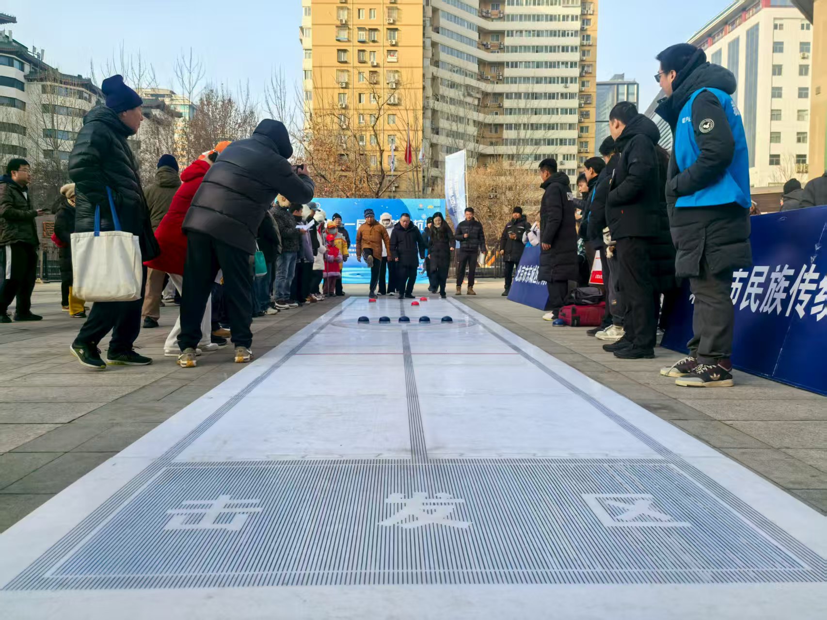 1月15日东城区第十一届冰蹴球比赛在东直门东环广场隆重举行。本次活动由东城区体育局、东城区体育总会、东直门街道主办,北京市民族传统体育协会、东城区社会体育管理中心承办,共吸引来自17个街道的100余名运动员参与,经过多场激烈的角逐,东直门街道荣获第一名。