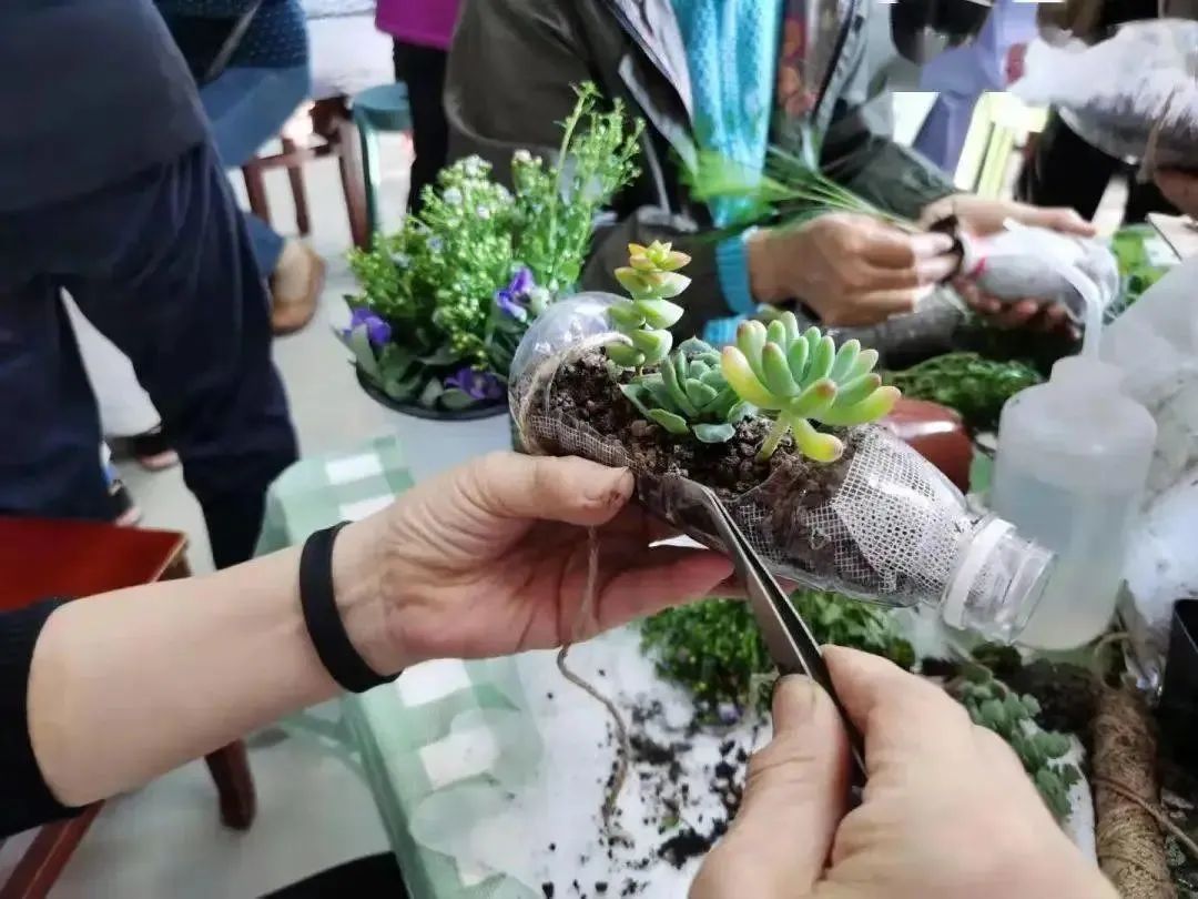 东城推进“零废循环小院”建设,图为居民利用废旧物品制作的倒置花盆和多肉花盆。