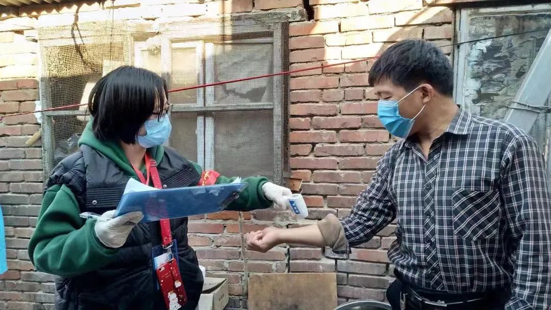 体育馆路街道西唐社区社工张莹正在为居民测量体温,并同步做好疫苗接种宣传工作