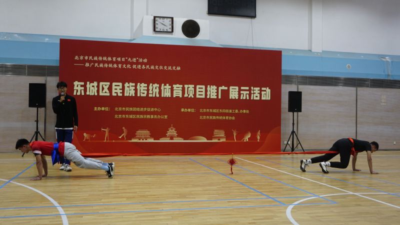 伴随着东城区回民小学舞蹈团带来的民族歌舞《白马》,由北京市民族团结进步促进中心、东城区民族宗教事务办公室共同举办的推广展示活动拉开帷幕。在现场展示环节,“沾衣十八跌”功夫跤、花毽、大象拔河、雪垒运动共四项民族传统体育项目逐一展现在观众眼前。