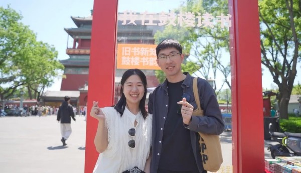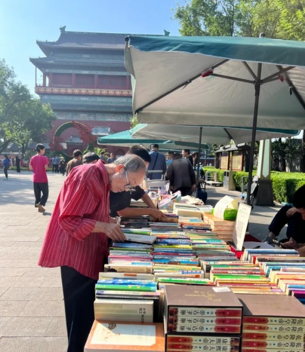 在钟鼓楼的红墙黄瓦间,“我在鼓楼读书”艺术装置以朱红立柱为框、灰瓦飞檐为背景,将“书本封面”造型与鼓楼轮廓精准契合,市民站在装置中央,便宛如“走入书中”与千年古建同框,不少人手持旧书驻足拍摄,晨钟暮鼓的光影透过书页缝隙落在笑脸上,定格成“城市记忆与个人阅读的对话瞬间”。线上直播间则打破时空界限,镜头聚焦精品书架,同步开启“线上寻书”服务,远程观众可委托工作人员代为挑选旧书,不少外地书友留言“隔着屏幕都闻到了纸墨香”。民乐快闪更让古建化身天然音乐厅,小堂鼓的铿锵与竹笛的悠扬在鼓楼券门间回荡,有老者手捧旧书驻足聆听,年轻人则举起手机记录,书页翻动声与乐声交织,成为钟鼓楼畔最动人的文化共鸣。