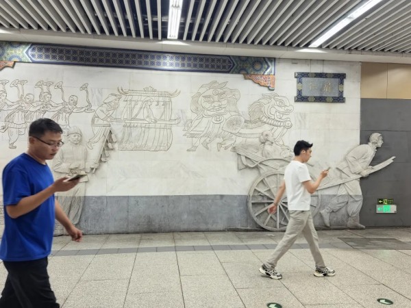 地铁列车驶入南锣鼓巷站,下车的人多了起来,大家都朝着一个方向走——南锣鼓巷主街。有的游客会被站厅内的一面琉璃壁画吸引,停下脚步驻足观看,墙面上的琉璃中镶嵌着北京生活老物件,拼贴成老北京典型的人物形象剪影,将老北京的记忆通过艺术形式展现与留存下来。一位游客惊喜地向同伴说:“这里有粮票、黑白照片,还有北京第十一届亚洲运动会的吉祥物邮票,都是我小时候见过的。”