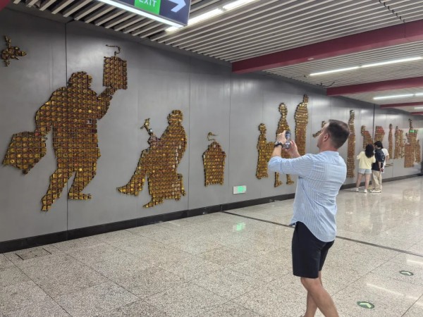 外国游客站在地铁南锣鼓巷站的琉璃壁画前拍照。