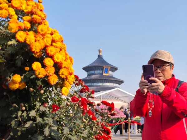 金秋送爽,菊韵飘香。10月28日,天坛公园第44届菊花展在祈年殿景区启幕,祈年门南两侧6000平方米的广场上,10000余株涵盖品种菊、大立菊、悬崖菊等多种类型的菊花竞相绽放,将古代皇家祭祀场所的恢弘与菊花的清雅完美融合。开展首日,祈年殿旁的菊海中,赏菊、拍照的游客络绎不绝。