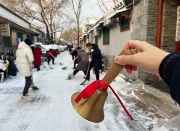 “叮当,叮当……”清脆的铜铃声穿透清晨的薄雾,在安定门街道宝钞社区的胡同深处久久回荡。这是东城胡同里独有的“扫雪集结号”,15年来始终是老胡同不变的约定。老街坊、小商户、驻区单位职工闻声而动,窄窄的胡同里瞬间热闹起来,铁锹撞击地面的铿锵声、邻里间的招呼声,交织成冬日里最暖心的乐章。