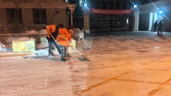 今晨六点的汇文中学考点外,龙潭街道的工作人员早已集结到位。大家挥舞着扫帚、铁锹,专注清理考点周边积雪,为参加高考英语听说机考的学子们,开辟出一条干净平整的“安心赶考路”。