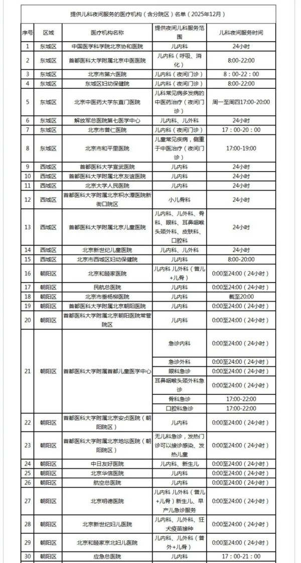 提供儿科夜诊服务医疗机构名单