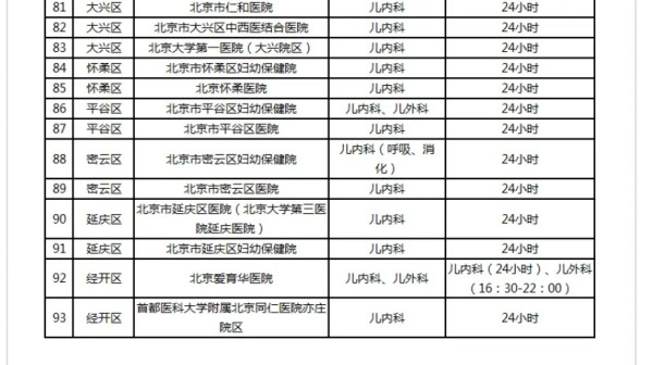 市卫健委日前介绍,方便儿童就近、便捷就诊,北京可提供儿科夜间诊疗服务的医疗机构(含分院区)增加至93家。同时,已开设儿科的妇幼保健机构增加夜间儿科急诊服务供给,目前16个区妇幼保健院均提供儿科夜间诊疗服务。其中,西城区、朝阳区、海淀区、石景山区儿科服务时间为8时至20时,东城区、门头沟区儿科服务时间为8时至22时,其余各区均提供24小时儿科服务。该委表示,医疗机构会依据诊疗实际状况对儿科门急诊服务的范围和时间进行动态调整,以满足服务需求。