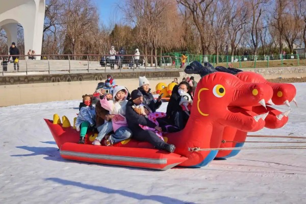 从龙潭中湖公园北门步入园内,一抬头便能看见“撒欢儿雪乐园”售票处排起了长队。