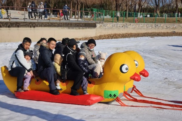 百余米长的雪圈大滑梯上,市民游客乘彩色雪圈飞驰而下;不远处的“雪地摩托火烈鸟”赛道上,家长抱着孩子驾驶萌趣造型的摩托快乐前行;在网红樱花树雪地转转区,雪圈化作“躺椅”,孩子们坐在上面体验飞一般的感觉。