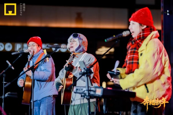 “新年氛围这么浓!‘福’字满街、五福巡树,晚上灯亮起来太有感觉了!”游客李女士和闺蜜一边拍照一边感叹。现场,互动表演率先点燃氛围,多支乐队轮番献艺,经典旋律与流行节奏交织,让街区充满活力。