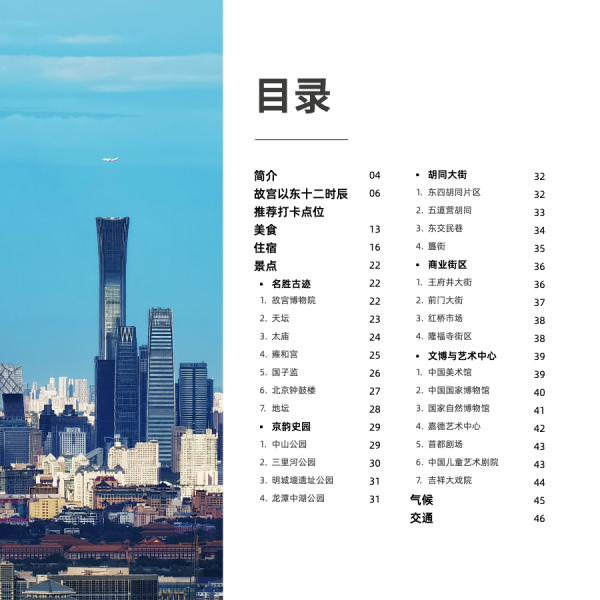 “当整座城市沉入一天中最深沉的睡眠,东华门外护城河的水面映着阑珊灯火。故宫角楼的剪影在寅时青灰色的天幕下格外分明,飞檐翘角沉默地指向星空。这里是昼夜交替的缝隙,是繁华与寂静的边界……”想要感受北京的古都底蕴与时代活力,东城区当属首选目的地之一。本次指南内容涵盖东城区吃住行游购娱全维度,将东城区丰富的文旅信息和资源凝练为“故宫以东十二时辰”推荐打卡点位、美食、住宿、景点、气候、交通六大核心板块,用国际化表达形式诠释“京味文化”的特质,推动东城区入境游产业发展。