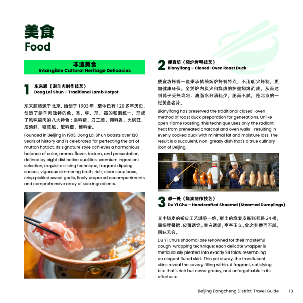 东城区美食丰富多样,既有历史悠久的老字号,也有特色鲜明的小馆子,成为彰显京味文化的重要载体。从东来顺、便宜坊、稻香村等承载传统非遗技艺的中华老字号,到豆汁儿、炒肝儿、驴打滚等烟火气十足的京味特色小吃,再到独具老北京特色的各式下午茶,每一种风味都是独属于东城区的美食记忆。指南美食板块详细介绍了各类美食的口味特色、历史渊源,方便入境游客精准寻觅美味,在味蕾之旅中体验京味文化。