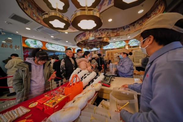义利面包、稻香村糕点、六必居酱菜、兔儿爷文创等京味美食、非遗文创深受市民游客喜爱。位于隆福寺南坊的北京稻香村零号寻宝馆人气爆棚,2月15日至23日期间,3款热销年味小食品总计销售16636公斤,销售额占门店总销售额的45%。
