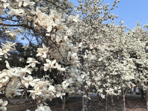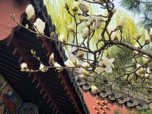 地坛公园皇祇室前,莹白的玉兰花缀满枝头,衬着朱红宫墙与翘角飞檐,端庄中多了几分热烈。方泽坛里,游客们或静静伫立欣赏玉兰与古建的交融之美,或借着春日兴致“跳坛”借位,用镜头定格灵动瞬间。