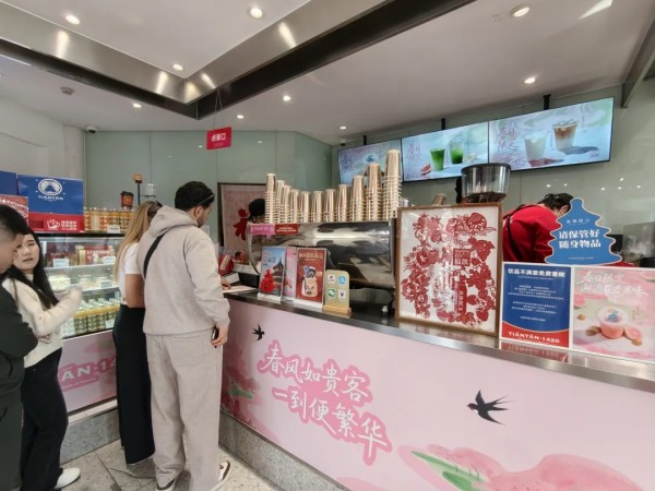 天坛公园的“天坛福饮”饮品店,排队的游客络绎不绝。