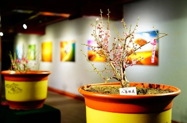 明城墙遗址公园东南角楼内举办的室内梅花盆景展。