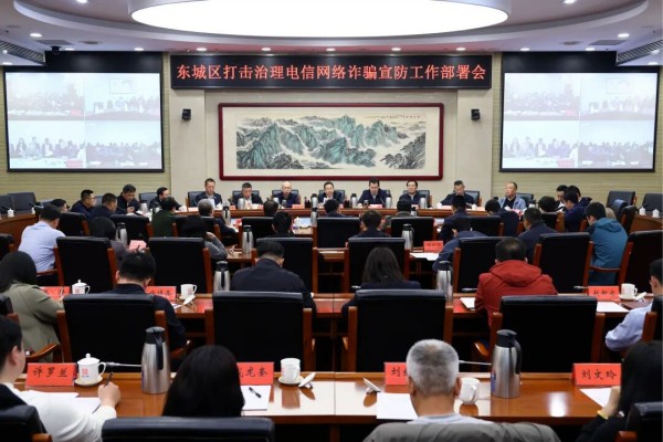 4月16日,东城区打击治理电信网络诈骗宣防工作部署会召开。区委书记孙新军出席会议并讲话。区领导陈献森、汤钦飞、薛国强、肖松、区法院院长何马根出席会议,中纪委、中央政法委、中央编办、中央国安办、人社部、商务部、应急部、公安部、最高检、最高法、全国侨联、宋庆龄基金会、市委政法委、市委网信办、国家大剧院、协和医院、解放军总医院第七医学中心等驻区单位相关负责同志参会。
