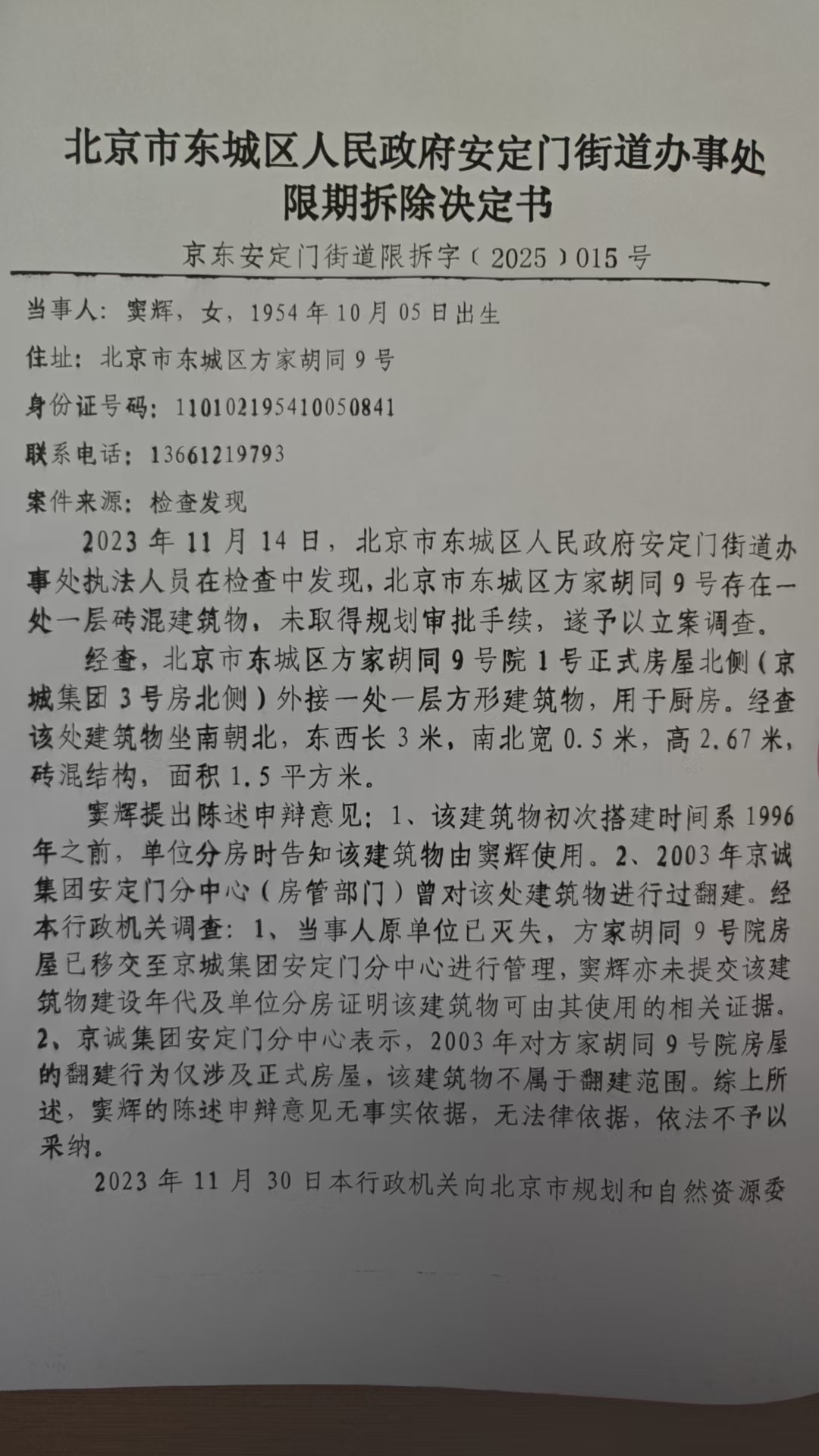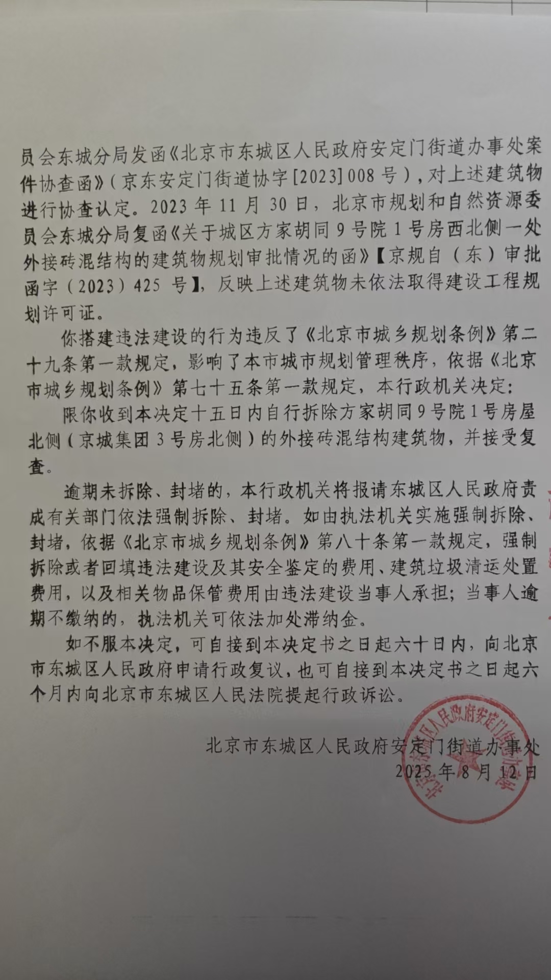 北京市东城区安定门街道办事处关于方家胡同9号的限期拆除决定书