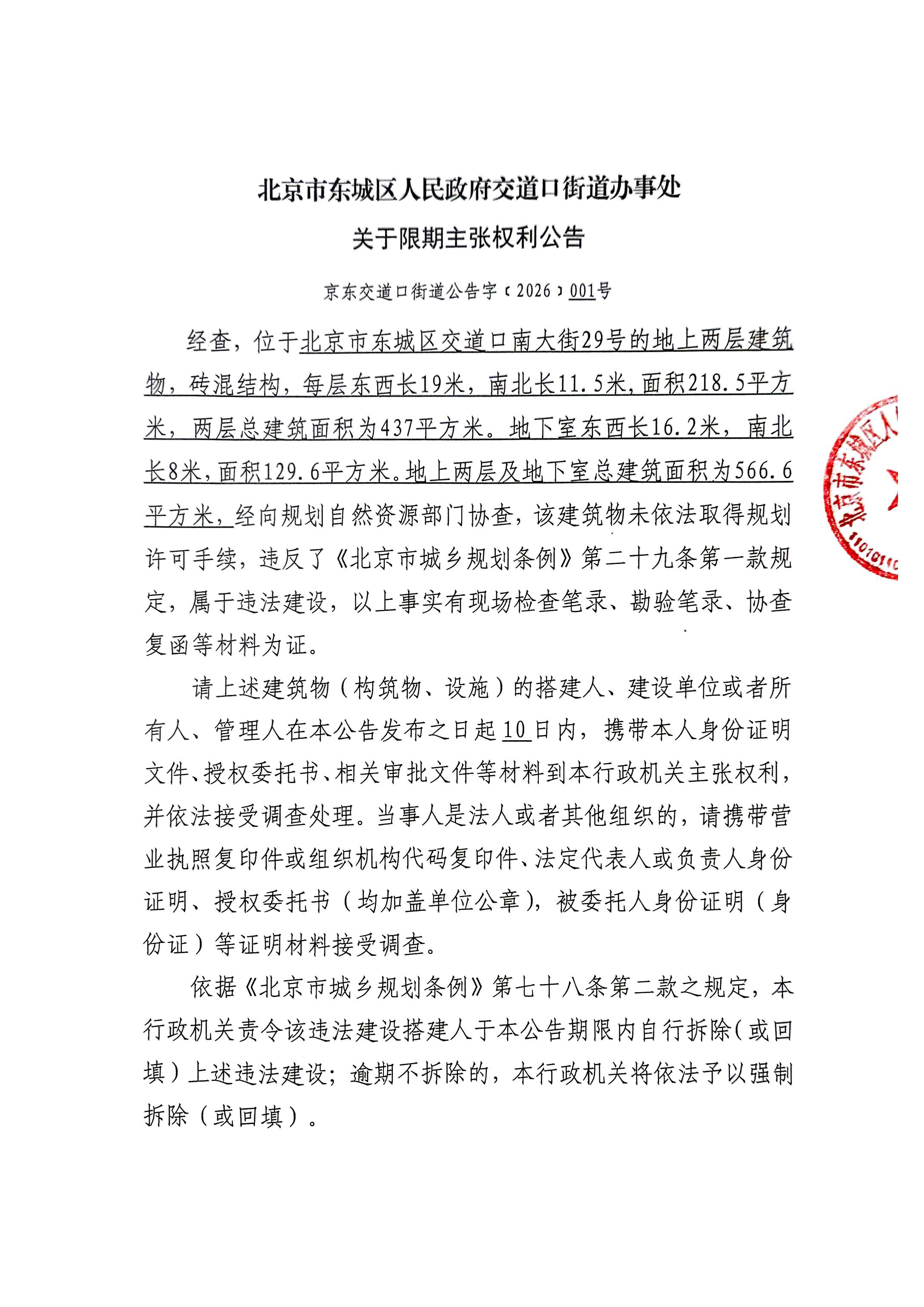 北京市东城区人民政府交道口街道办事处关于限期主张权利公告京东交道口街道公告字﹝2026﹞001号