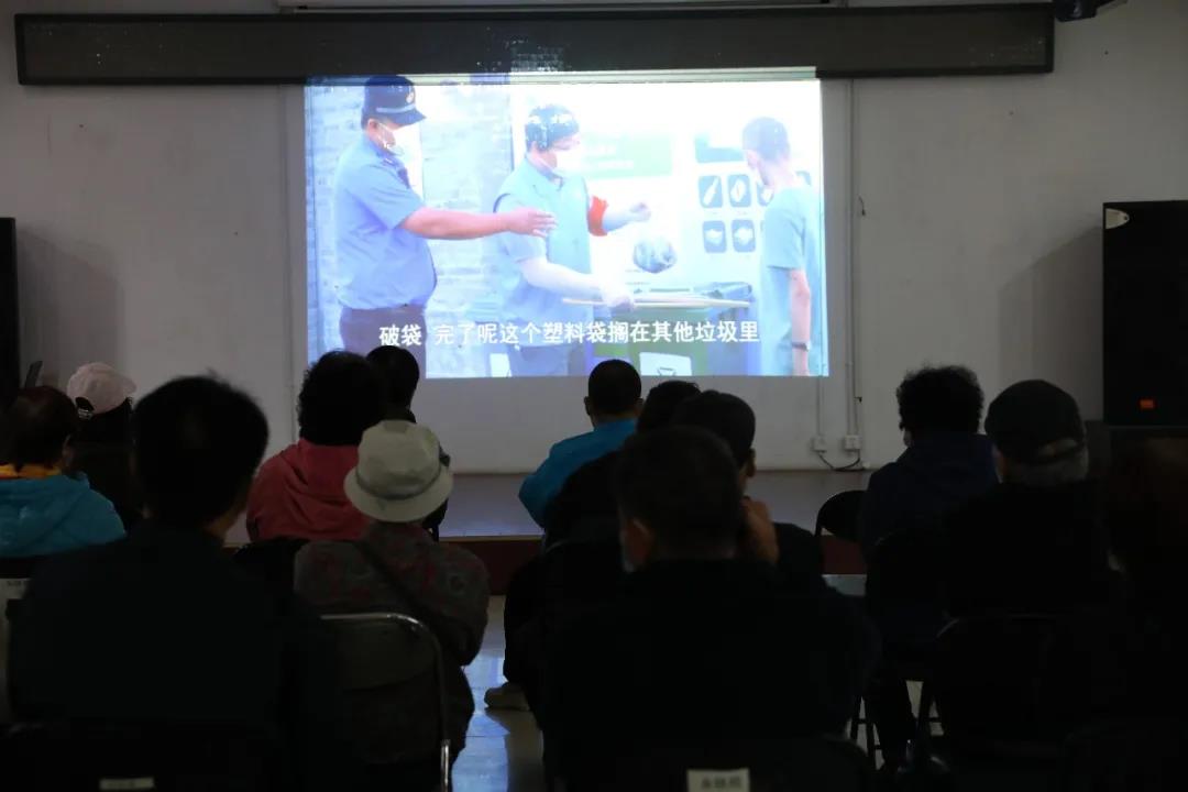 在社区工作人员进行简要介绍后,投影屏幕开始播放着讲述发生在胡同里居民之间垃圾分类日常小故事的微电影《胡同城管》,居民们聚精会神的观影,还有居民不时拿着小本进行记录。随着剧情的发展,影片里围绕垃圾分类发生的小故事以及日常生活情景再现和城管队员进社区普法的场景,引起了社区居民们的共鸣和阵阵欢笑声,而有关新修订的《北京市生活垃圾管理条例》知识和垃圾分类小技巧也都恰如其分的融入其中,影片最后在热烈的掌声中结束。