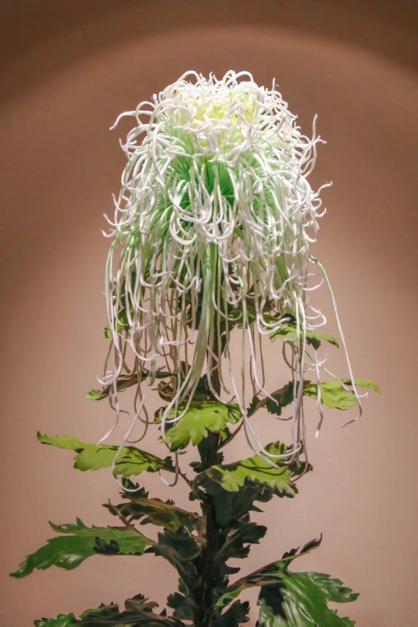 金铁铃大师的国家级非遗“北京绢花”经典作品《十丈珠帘》,以丝绸绫绢为材,染作秋菊的皎洁之色,丝丝缕缕的花瓣薄如蝉翼。