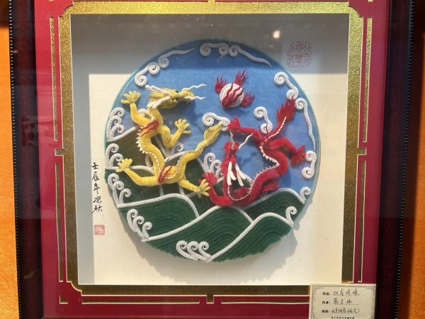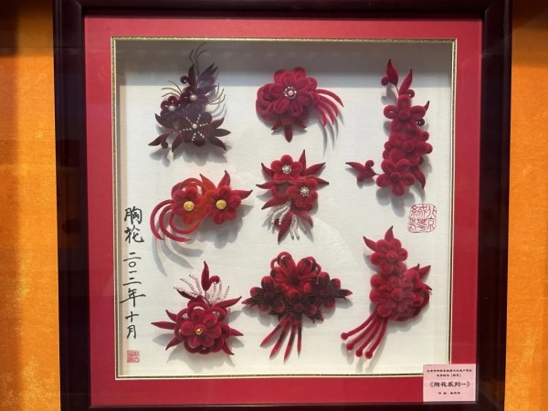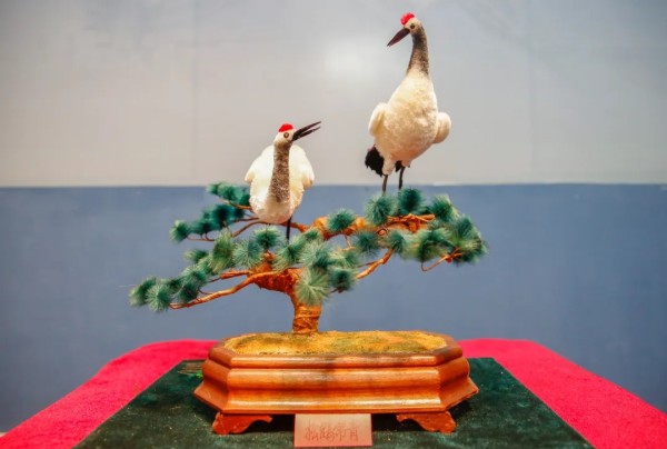 蔡志伟大师的北京市级非遗“绒鸟(绒花)”作品《松鹤常青》,仙鹤红顶素羽,神态鲜活,松枝层叠葱郁,传递着“松鹤长春,福寿延绵”的美好祝愿。