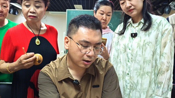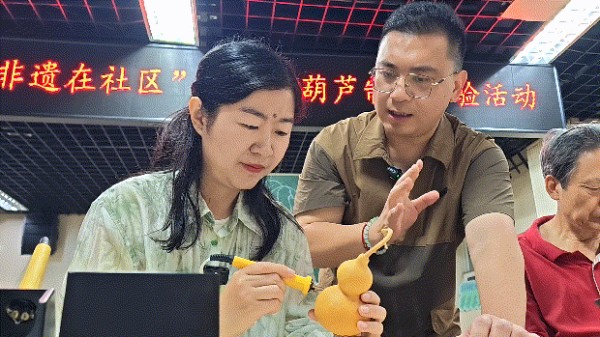 “这就像工笔画里的渲染一样,咱们一层层晕染上去……”韩老师的讲解简洁明了,居民们纷纷拿起烙笔,屏息凝神地在葫芦上创作。