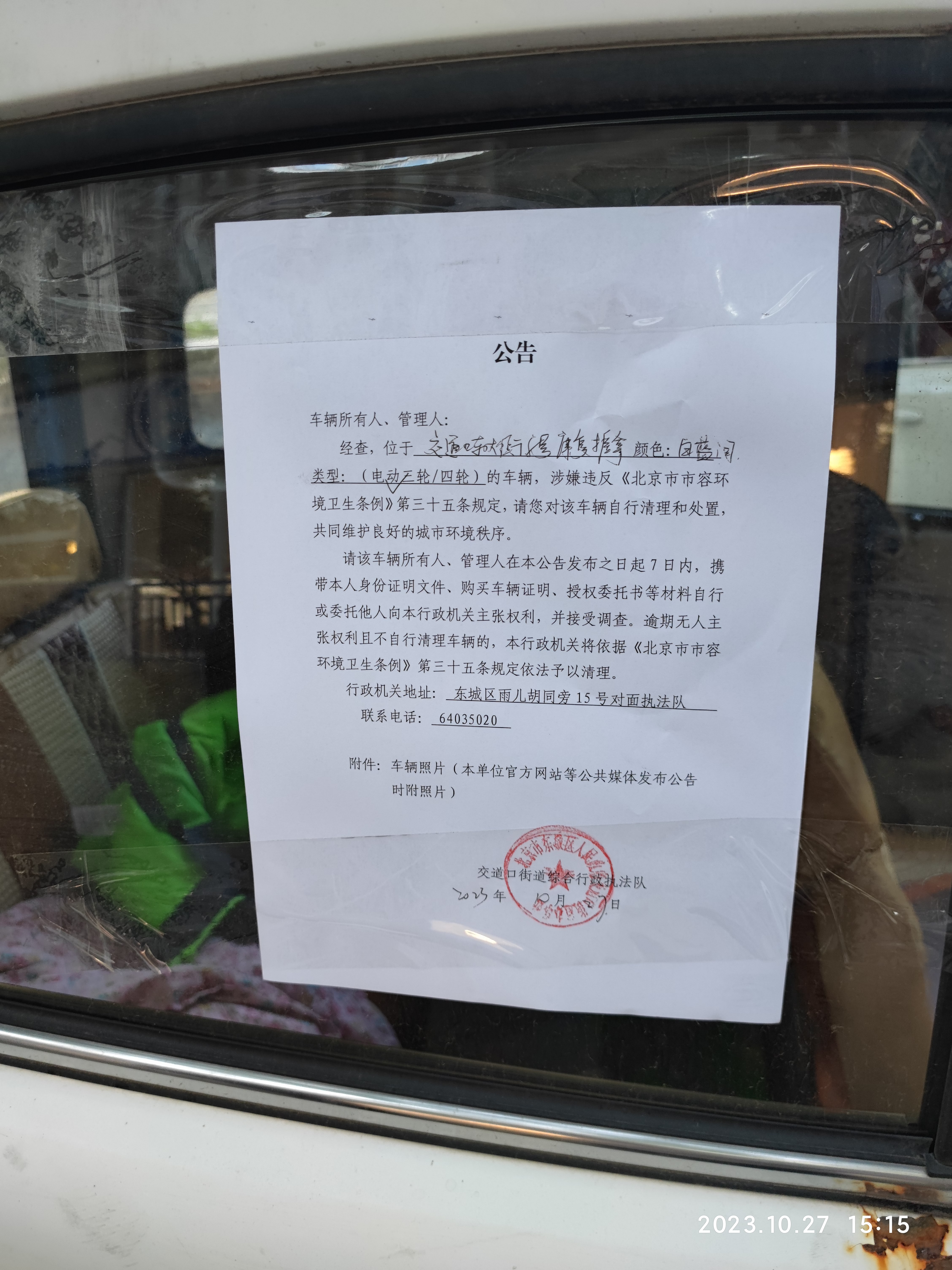 车辆自行清理和处置公告(交道口东大街8号楼康复)