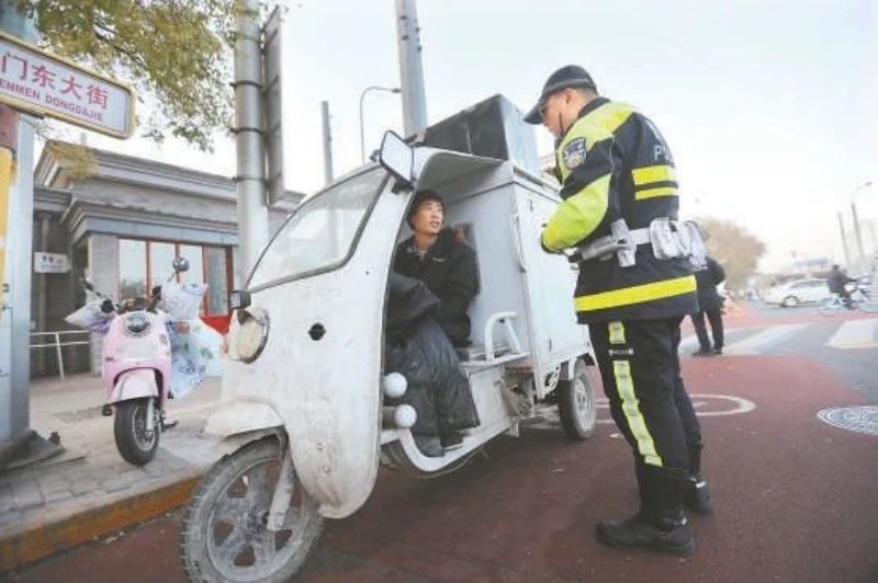 “您这个车还有40天,明年1月1日可就不能上路了。”昨天上午,东城交通支队前门大队交警在崇文门路口,对每一位仍在使用违规电动三四轮车的骑行人发出提示。自11月1日全市开展路口交通秩序环境专项治理行动之后,骑车人和行人的路口守法率明显提高,交警也有了更多时间,对违规电动三四轮车使用人展开更细致的宣传。