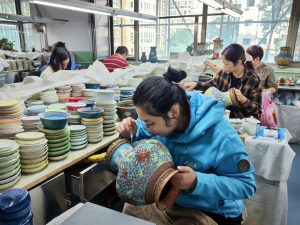 走进珐琅厂的手工车间,瞬间沉浸到安静、专注的氛围里。景泰蓝制作的复杂工序在此展开,师傅们正专注地进行掐丝、点蓝等操作。掐丝师傅手持铜丝,按照设计图纸在铜胎上弯曲、粘贴,每一个弧度都精准无误。点蓝师傅用特制的小滴管,将各色釉料小心翼翼地填入铜丝间隙,色彩搭配和谐统一。