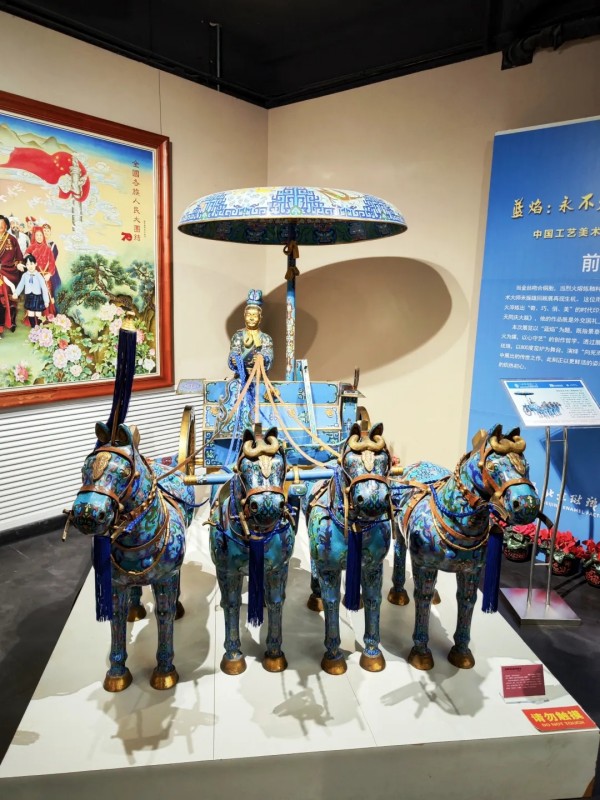 三楼的中国景泰蓝艺术博物馆,是珐琅厂的“宝藏之地”。这里陈列着上百件景泰蓝珍品,既有复刻的明清古器,也有现代大师的代表作。镇馆之宝《秦陵铜马车》尤为震撼,按照1:1比例制作,铜马车的细节栩栩如生,釉色饱满温润,再现了国宝的庄严与精美。