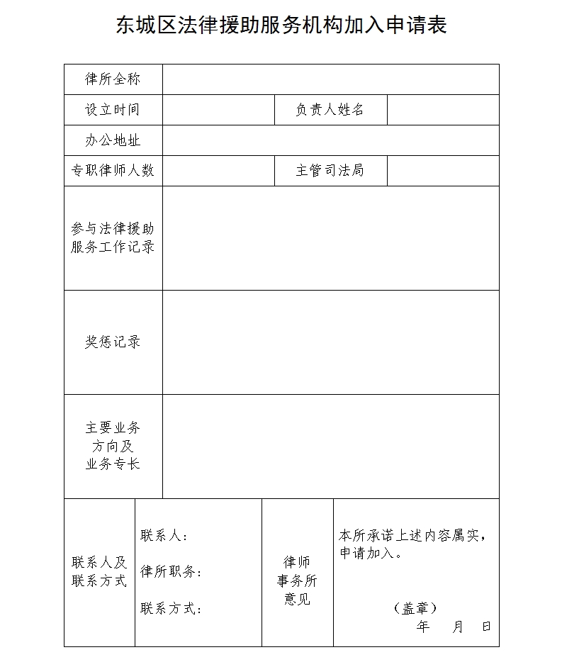 满足上述条件的法律服务机构填写《东城区法律援助服务机构加入申请表》(见附件1)并加盖本机构公章,与律师事务所执业证书复印件(含2024年度检查考核结果页)及北京市范围内法律援助机构开具的《参与法律援助服务工作证明》(模板见附件2)或东城区法律援助中心开具的《参与劳动仲裁公益值班工作证明》一并提交东城区法律援助中心,报名截止时间为2024年12月18日(邮寄材料的以邮寄日期为准),东城区司法局、东城区法律援助中心经审核后公布招募名单,并与入围法律服务机构订立服务关系。