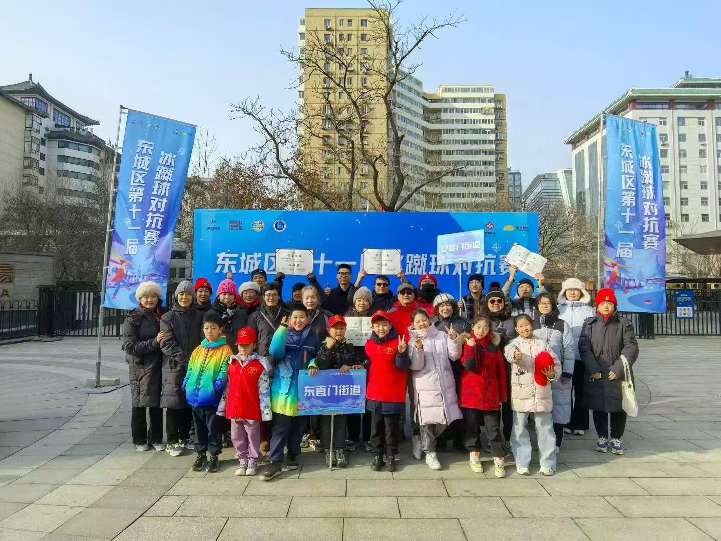 1月15日东城区第十一届冰蹴球比赛在东直门东环广场隆重举行。本次活动由东城区体育局、东城区体育总会、东直门街道主办,北京市民族传统体育协会、东城区社会体育管理中心承办,共吸引来自17个街道的100余名运动员参与,经过多场激烈的角逐,东直门街道荣获第一名。