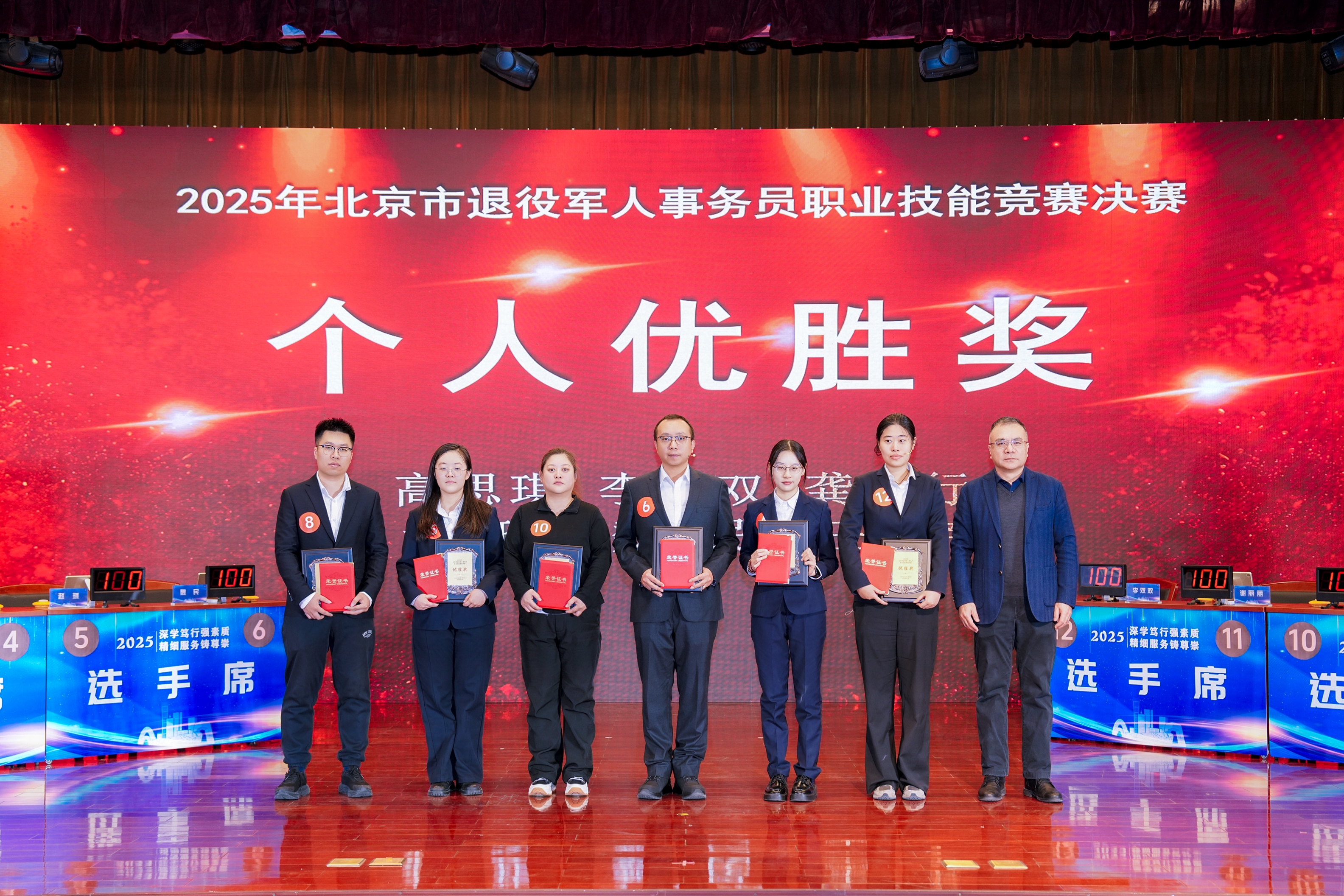这是一支“00后”青春战队,他们分别是东城区退役军人服务中心王一博、交道口街道退役军人服务站姚旭冉、龙潭街道退役军人服务站高思琪,更是一支本领过硬的攻坚铁军,身披东城战袍,带着全区退役军人事务工作者的期盼出征赛场,以青春之名赴巅峰之约,用实干之力竞逐荣耀之巅!赛场上,必答题稳扎稳打、字字精准,尽显政策功底过硬;竞速题反应神速,彰显临场应变果敢从容;风险题迎难而上,诠释东城铁肩担当魅力;情景模拟情真意切、处置专业,践行为军服务的初心使命!场下助阵团队激情高昂,口号四起,震彻全场!晋级赛、突围赛、总决赛,两日鏖战、三战连捷,他们顶住压力、越战越勇,从全市强手中突围,从激烈角逐中登顶,用汗水浇灌荣誉,用实力摘得桂冠!