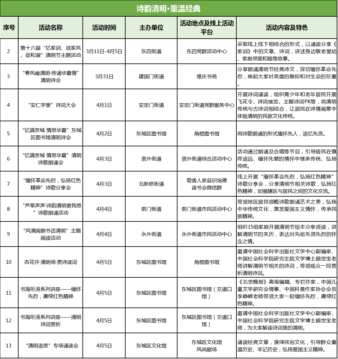 诗词是中华文化的瑰宝,通过朗诵,我们可以感受到诗词的美丽与力量,也更好地了解中华文化。节日期间,区图书馆举办书海听涛系列讲座,邀请李峥嵘、顾世宝老师,为大家带来缅怀先烈、清明诗词鉴赏等专题讲座。各街道通过清明节诗歌诵读、系列讲座等方式,进行节日主题作品和诗歌分享,如东四街道举办第十六届“忆家训、谈家风、促和谐”清明节主题活动,安定门街道举办“安仁学堂”诗词大会,建国门街道举办“春风暖清明·传诵华夏情”清明诗会,前门街道举办“芦草声声·诗韵清明寄我思”诗歌朗诵活动。各街道用声音追思,用声音礼赞,在家风家训、英模事迹、民俗文化中继承先烈遗志、弘扬优良传统,表达大家的家庭之爱、民族大爱。