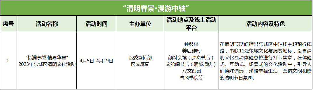 4月5日,“清明春景·漫游中轴”2023年东城区清明文化活动将在钟鼓楼广场拉开帷幕,将邀请文化名人、骑行爱好者、盖章达人等,沿着一条清明主题的东城区文化线路,以踏青的习俗形式,前往钟鼓楼、美后肆时、明城墙遗址公园、颜料会馆、77文创园等11处中轴线沿线的东城文化与消费地标进行打卡,吸引群众广泛参与,感受东城区与中轴线的历史文化魅力。此次活动将于4月5日—4月19日持续开展,分为“万物清明”“寒食怀古”“上巳踏青”三个板块,涵盖历史建筑、戏剧曲艺、阅读空间、文化艺术等众多类别,在传播清明文化,展示路线各打卡点的同时,设置多项清明文化互动体验,引导广大市民在四合院集市快意游园,在实体书店诗词对答,在前门三里河欣赏繁花似锦,在吴裕泰品尝春季绿茶,在体验式、互动式、场景式的文化活动中,感受清明节日节气的文化魅力。