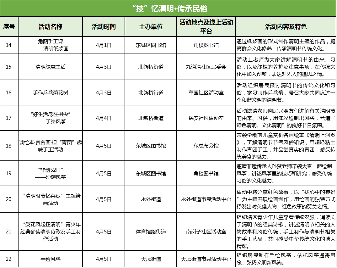 为弘扬中华传统文化,深入挖掘清明节的文化内涵,东城区将举办知识讲座、手工制作等活动,进行清明节知识普及和文化习俗讲解,让广大市民在手作中感受传统文化,在重温历史中感恩当下。如角楼图书馆举办清明纸浆画手工课活动,区图书馆东总布分馆举办读绘本·赏名画·捏“青团”趣味手工活动,带领大家感受清明民俗文化和手工制作的独特魅力。角楼图书馆邀请非遗传承人孙贺老师带领大家一起制作扎燕风筝,北新桥街道举办“好生活尽在指尖—手绘风筝”活动,天坛街道组织居民制作手绘风筝,共同营造清明时节“初春纸鸢漫天舞”的节日氛围,让广大市民领略中华传统文化的质朴浪漫。