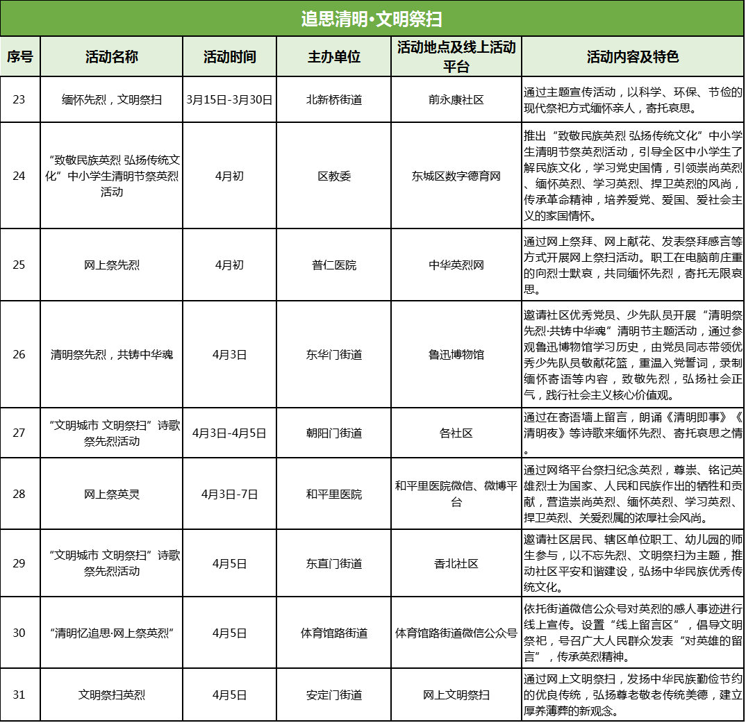 万物复苏,又遇清明。清明节到来之际,为更好地传承中华优秀传统文化,弘扬民俗传统,东城区以“忆满京城 情思华夏”为主题,举办“1+4+N”清明节系列文化活动,即举办“清明春景·漫游中轴”主场文化活动,策划举办“诗韵清明·重温经典”“‘技’忆清明·民俗传承”“追思清明·文明祭扫”“春和景明·游园踏青”四大品类30余项清明节文化活动,集线上传播、线下体验于一体,引导人们慎终追远,珍惜幸福生活,营造文明和谐的清明节日氛围。
